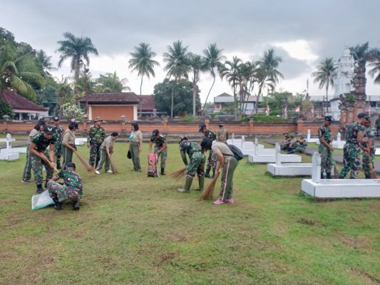 Dengan semangat gotong royong, tampak anggota Kodim 1617/Jembrana baik Militer maupun PNS bersama anggota Anggota Yonif Mekanis 741/GN melaksanakan pembersihan mulai pintu masuk hingga areal Makam TMP Kesatria Wijaya Kusuma. Pembersihan dilakukan dengan menyapu daun daun kering disapu kemudian buang pada tempatnya.