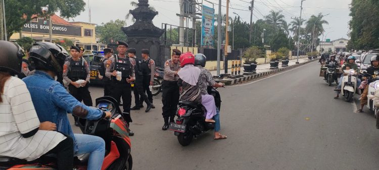 Kegiatan ini dipimpin langsung oleh Kasat Samapta Polres Bondowoso AKP Maryatno beserta anggotanya membagikan takjil kepada masyarakat yang melintas di depan Mapolres Bondowoso.