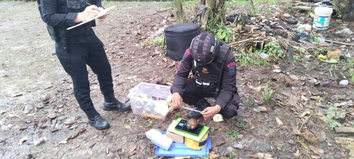 Persindonesia.com Sumsel, Personel Satbrimob Polda Sumsel Detasemen Gegana melaksanakan Penanganan Barang Temuan Yang di Duga Handak Militer Jenis Granat Tangan di Wilayah Hukum Polsek Talang Kelapa Polres Banyuasin, Minggu, (2/06/2024)