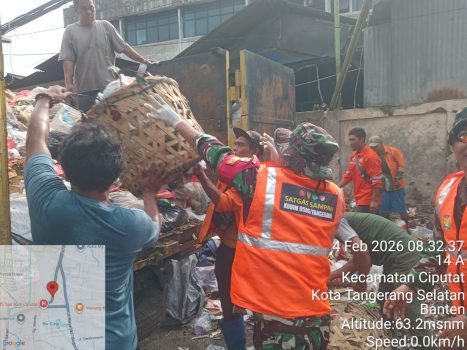 Kodam Jaya, Tangerang,Persindonesia.com – Satgas Sampah Kodim 0506/Tangerang melalui Koramil 05/Ciputat turun langsung menangani persoalan sampah di Pasar Jombang, Jalan Jombang Raya, Kelurahan Jombang, Kecamatan Ciputat, Kota Tangerang Selatan, Rabu (4/2/2026). Kegiatan kerja bakti bertajuk Bersih-Bersih Sampah Kota Tangerang Selatan itu dimulai pukul 07.00 WIB hingga selesai dengan melibatkan unsur pemerintah pusat, daerah, serta masyarakat.