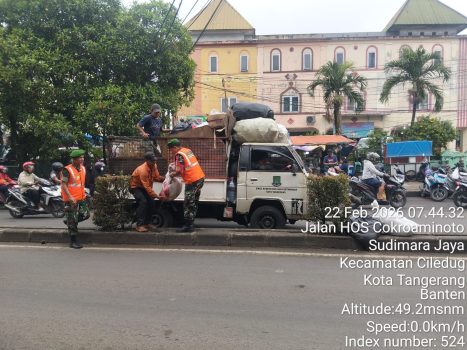 Kodam Jaya, Tangerang,Persindoneia.com- Tumpukan sampah yang mengganggu pemandangan dan kenyamanan pengguna jalan di jalur Jalan Hos Cokroaminoro Ciledug Kota Tangerang, di bersihkan satgas sampah Koramil 04/Ciledug, Kodim 0506/Tgr, Minggu (22/02/2026).