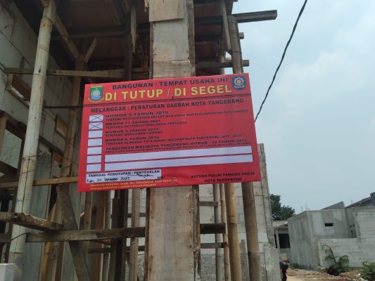 Kota Tangerang,Persindonesia.com – Cluster property Nur resident di segel Satuan Polisi Pamong Praja (Satpol-PP)Kota Tangerang lantaran tidak memiliki Persetujuan Bangunan Gedung (PBG) , Selain itu diduga pemilik cluster juga melakukan penyerobot tanah,Sabtu (23/9/2023).