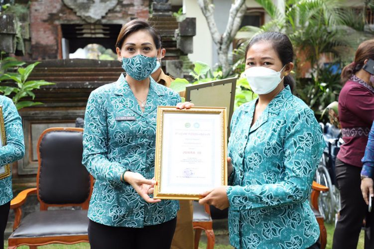 Persindonesia.com Gianyar – Ketua TP.PKK Kabupaten Gianyar Ny. Surya Adnyani Mahayastra, menyerahkan hadiah lomba video vlog, lomba pelaksana terbaik 10 program pokok PKK dan lomba kegiatan posyandu, serangkaian Bulan Bung Karno Tahun 2021 Kabupaten Gianyar. Hadiah diserahkan secara simbolis di halaman Sekretariat kantor TP.PKK Kabupaten Gianyar, pada Senin (23/8).