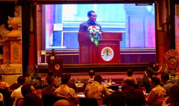 BADUNG – Ditandai pemukulan gong, Sekretaris Daerah Provinsi Bali, Dewa Made Indra membuka Rapat Kerja (Raker) Pembangunan Lingkungan Hidup dan Kehutanan Wilayah Ekoregion Bali dan Nusa Tenggara di Discovery Kartika Plaza, Kuta , Badung, Selasa (25/6).