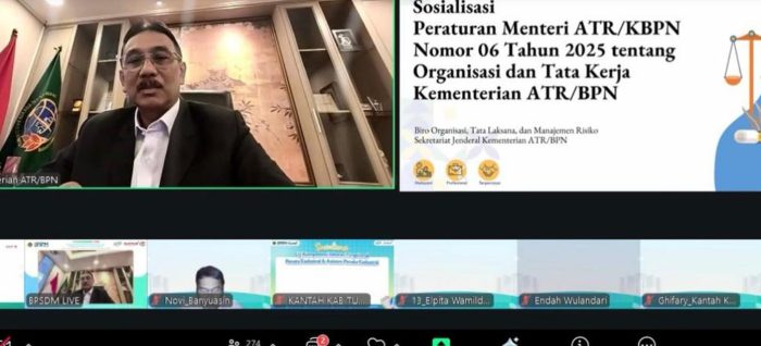 JAKARTA Persindo β Kementerian Agraria dan Tata Ruang/Badan Pertanahan Nasional (ATR/BPN) terus memperkuat tata kelola organisasi melalui sosialisasi Peraturan Menteri ATR/Kepala BPN Nomor 6 Tahun 2025 tentang Organisasi dan Tata Kerja. Regulasi ini diharapkan menjadi pedoman bagi seluruh unit kerja, baik di pusat maupun daerah, dalam menjalankan tugas dan fungsi secara lebih efektif.