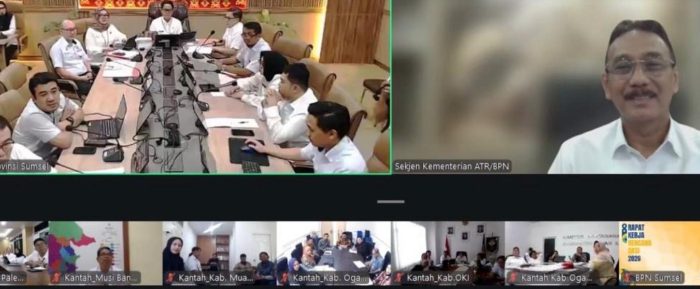 Jakarta Persindonesia.com – Sekretaris Jenderal Kementerian Agraria dan Tata Ruang/Badan Pertanahan Nasional (ATR/BPN), Dalu Agung Darmawan, memberikan arahan kepada jajaran Kantor Wilayah BPN Provinsi Sumatera Selatan dalam kegiatan Rapat Kerja Daerah (Rakerda) yang berlangsung secara daring pada Kamis (5/3/2026).