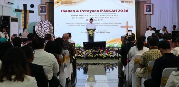 Tangerang Selatan Persindo β Menteri Agraria dan Tata Ruang/Kepala Badan Pertanahan Nasional (ATR/BPN), Nusron Wahid, menghadiri perayaan dan ibadah Paskah yang diselenggarakan oleh Persekutuan Umat Kristiani Kementerian ATR/BPN pada Jumat (24/04/2026). Kegiatan ini digelar secara hybrid dari Aula Kantor Pertanahan Kota Tangerang Selatan dan diikuti jajaran kementerian dari berbagai daerah.