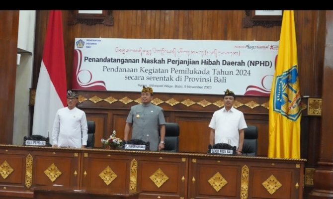 DENPASAR – Penjabat (PJ) Gubernur Bali S.M Mahendra Jaya secara langsung melakukan penandatanganan dan penyerahan Naskah Perjanjian Hibah Daerah (NPHD) secara serentak (seluruh Kabupaten/Kota di Bali), yang menjadi salah satu penanda kesiapan melaksanakan tahapan Pilkada di Bali, terkait anggaran untuk kebutuhan Pilkada 2024 yang sudah tersedia. Penyerahan dilakukan di Gedung Wiswa Sabha Utama, Kantor Gubernur Bali, Denpasar, Kamis (9/11).