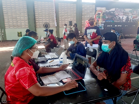 Serbuan Vaksinasi yang dilaksanakan pada Sabtu (26/6/2021) di seluruh Indonesia mendapat antusias yang tinggi dari masyarakat di berbagai daerah, terbukti masyarakat berbondong-bondong datang ke lokasi pelaksanaan vaksinasi untuk di suntik vaksin.