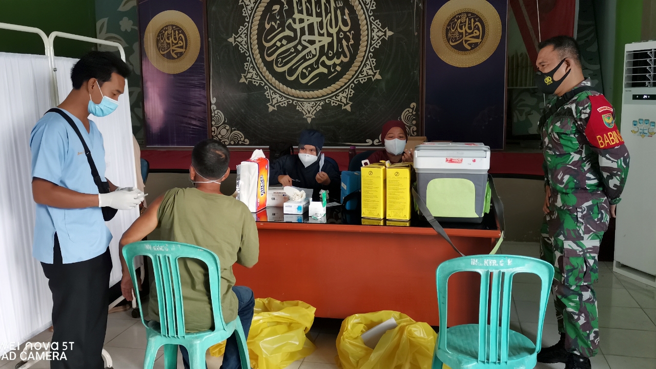 KELAPA KAMPIT — Babinsa Koramil 414-05/Kelapa Kampit Serda Ivan Juasi,Kamis 29/04/2021 melakukan pendampingan dalam pelaksanaan penyuntikan vaksinasi Covid-19 tahap I untuk para Lanjut usia (Lansia) yang dilakukan oleh Petugas Kesehatan.