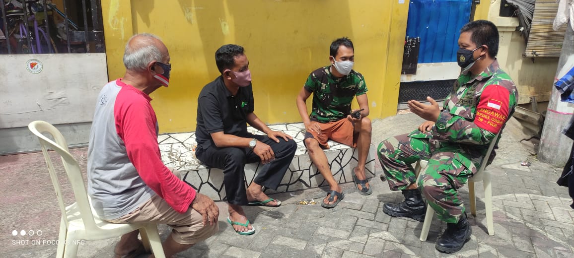 Serma Ari May L Babinsa Priuk Jaya melakukan Komsos dengan warga binaan untuk meningkatkan Kamtibmas, Keamanan lingkungan dan menekankan protokol kesehatan dan menjaga kebersihan.