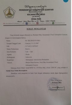- Sebidang tanah terletak di Alamat Letak Keadaan Tanah: NIB Pemetaan Desa Mas, Kecamatan Ubud 22050403.03499. Bidang tanah ini sudah dipetakan Berdasarkan dokumen pendaftaran tanah yang ada pada Kantor kami, bidang tanah tersebut dinyatakan sudah diterbitkan Sertipikat dengan Nama pemegang hak Sertipikat Luas Asal Hak Status Buku Tanah.