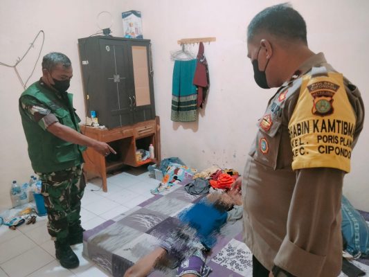 Kodam Jaya, Tangerang ,Persindonesia.com- Sertu Mahmudi Babinsa Poris Plawad Koramil 01/Tgr, Kodim 0506/Tgr membantu evakuasi penemuan mayat di Kontrakan di RT 04/03 Kelurahan Poris Plawad Kecamatan Cipondoh Kota Tangerang, Selasa (15/02/2022).