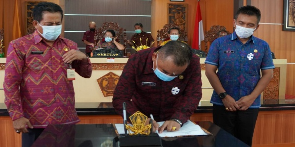Bupati Jembrana I Nengah Ledang kepada Bupati dan Wakil Bupati tahun 2021-2024, I Nengah Tamba dan I Gede Ngurah Patriana Krisna. Dilanjutkan, penandatanganan berita serah terima jabatan.