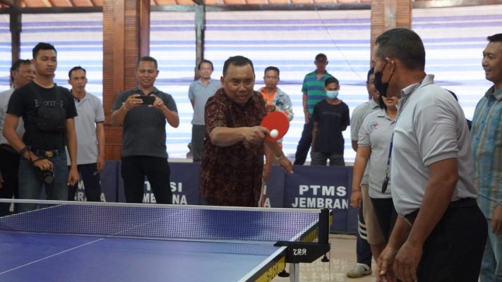 Persindonesia.com Jembrana – Bupati Jembrana I Nengah Tamba bersama Wakil Bupati Jembrana I Gede Ngurah Patriana Khrisna selaku Ketua Umum KONI Jembrana Buka Turnamen Tenis Meja “Smash On Drugs” Jembrana Open se-Bali 2022 ditandai dengan pemukulan bola pertama, di Mendapa Kesari Jembrana. Turnamen diselenggarakan Persatuan Tenis Meja Seluruh Indonesia (PTMSI) Jembrana dalam rangka memeriahkan HUT Kota Negara ke-127 dan HUT RI ke-77. Minggu (21/8/2022)