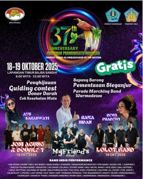 Perayaan HUT HPI Bali ke-37 yang mengusung tema “Tourist Guide as Ambassador of The Nation” akan berlangsung selama dua hari, 18–19 Oktober 2025, mulai pukul 09.00 hingga 23.00 WITA. Acara ini gratis untuk masyarakat umum dan menampilkan berbagai hiburan menarik, di antaranya: Donor darah & cek kesehatan mata, Guiding Contest, Penampilan Bapang Barong dan Bleganjur, Parade Marching Band Warmadewa, Konser musik oleh artis dan band ternama seperti Joni Agung & Double T, Lolot Band, Raka Sidan, Ayu Saraswati, Dewi Pradewi, serta My Friend’s Band, ditambah puluhan band indie terbaik Bali.