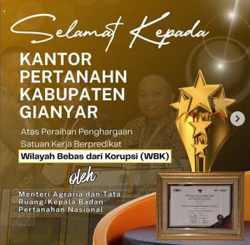Gianyar Bali Persindonesia.com – Kantor Pertanahan Kabupaten Gianyar kembali menorehkan prestasi membanggakan dengan meraih Predikat Satuan Kerja Wilayah Bebas dari Korupsi (WBK) dari Kementerian Agraria dan Tata Ruang/Badan Pertanahan Nasional (ATR/BPN). Penghargaan di akhir tahun ini menjadi bukti nyata atas komitmen kuat dalam menjalankan reformasi birokrasi serta menghadirkan pelayanan publik yang bersih, transparan, dan akuntabel.