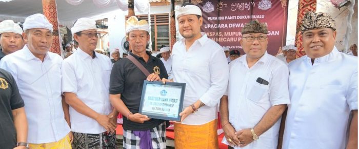 Hadir dalam puncak upacara tersebut, Wakil Bupati Badung, I Ketut Bagus Alit Sucipta. Kedatangan Wabup disambut hangat oleh para pengempon pura dan tokoh masyarakat. Dalam suasana yang khusyuk dan penuh kebersamaan, Wabup turut menandatangani prasasti peresmian pura dan menyerahkan secara simbolis bantuan dana hibah sebesar Rp2 miliar serta dana punia Rp25 juta dari Pemerintah Kabupaten Badung.