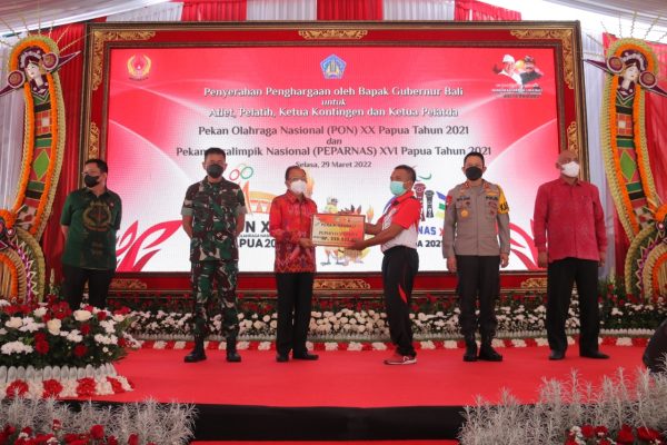 Denpasar (Persindonesia.com)– Sebagai wujud perhatian dan apresiasi kepada Atlet yang memperoleh medali emas, perak dan perunggu dalam ajang PON XX Papua, Pemerintah Provinsi Bali memberikan penghargaan untuk para atlet, pelatih, ketua kontingen dan ketua Pemusatan Latihan Daerah (Pelatda) PON XX Papua Tahun 2021 dan Pekan Paralimpik Nasional (Peparnas) XVI Papua Tahun 2021.