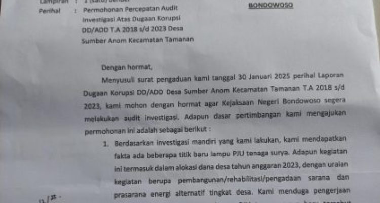 Khawatir Kades Mengaburkan Fakta di Lapangan, Pelapor Kasus Dugaan Korupsi Anggaran DD Desa Sumber Anom Minta Kejari Melakukan Audit Investigasi BONDOWOSO|Februari 12, 2025Februari 12, 2025oleh Kaperwil Jatim BONDOWOSO, PersIndonesia.com – Laporan dugaan korupsi dana desa tahun anggaran 2018 s/d Baca Selengkapnya