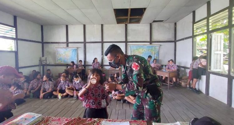 Anggota Satgas Yonif 144/JY Bersama Nakes Puskesmas Berikan Obat Cacing di SDN 02 Perbatasan