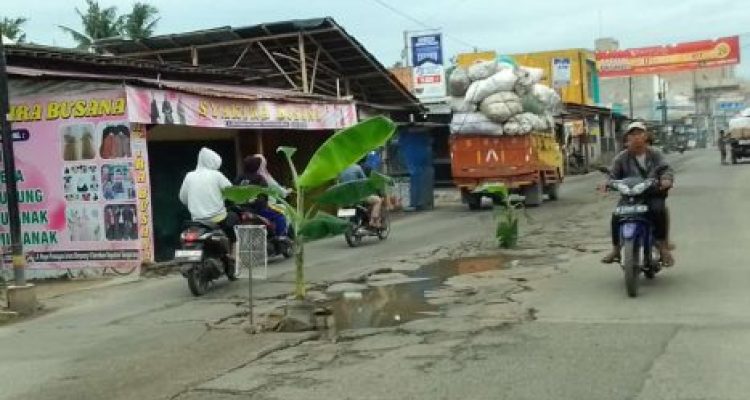 Protes Kondisi Jalan Rusak,Warga Sepatan Tanam Pohon Pisang di Tengah Jalan Raya