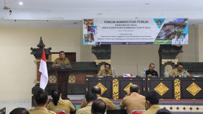 Persindonesia.com Jembrana – Pemerintah Kabupaten Jembrana melalui Badan Perencanaan Pembangunan Daerah, Penelitian dan Pengembangan (Bappedalitbang) melaksanakan Konsultasi Publik Rancangan Awal RKPD Kabupaten Jembrana Tahun 2024. Dengan tema Optimalisasi Sektor Unggulan Untuk Mewujudkan Pertumbuhan Ekonomi Insklusif Dan Penghapusan Kemiskinan Ekstrem Berbasis Data, kegiatan digelar di Ruang Rapat Lt. 2 Jimbarwana, Kantor Bupati Jembrana, Senin (6/2/2023).
