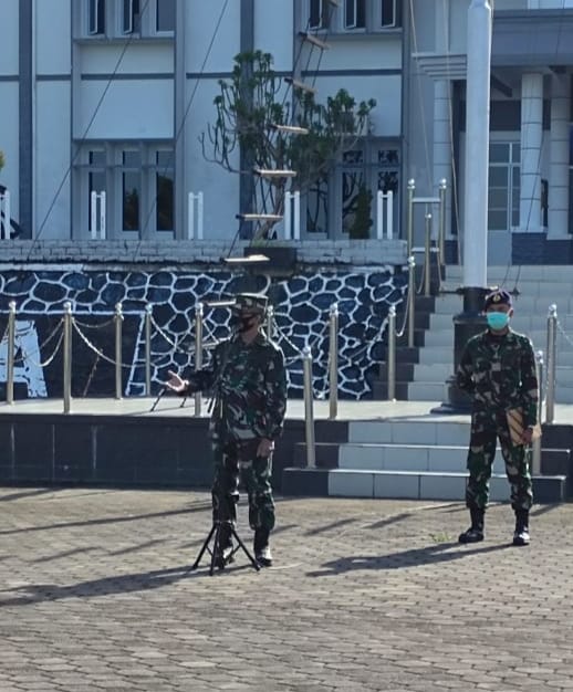 Wakil Komandan Pangkalan Utama TNI Angkatan Laut (Wadanlantamal) IV Tanjungpinang Kolonel Marinir Andi Rahmat M, memberikan pengarahan pada saat apel gabungan dihadapan segenap Prajurit dan Pns Lantamal IV di Lapangan Apel Markas Komando (Mako) Lantamal IV, Jl. Yos Sudarso No.1 Batu Hitam Tanjungpinang, Kepulauan Riau, Senin pagi (03/5/2021).