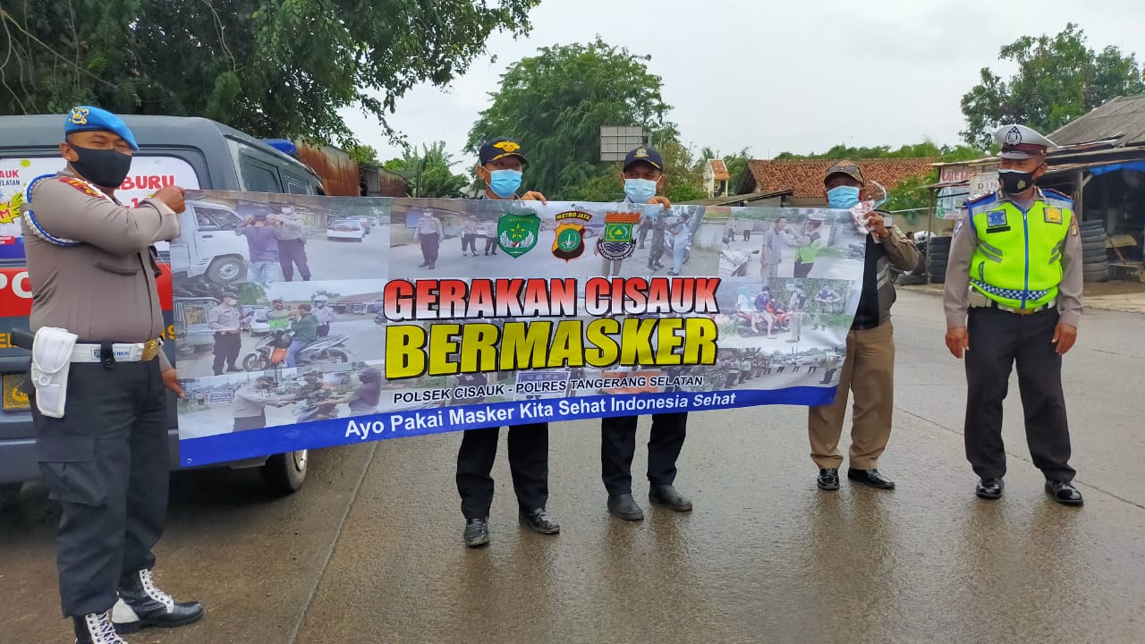 Giat pembagian masker oleh Polsek di Jalan Raya Lapan – Cisauk di Pertigaan jalan Baru Suradita Desa Suradita Kec. Cisauk Tangerang kepada Masyarakat yang melintas jalan kaki maupun menggunakan kendaraan Roda 2 maupun Roda 4 atau lebih dengan menurunkan 6 Personil Polsek Cisauk,4 personil Dishub Kabupaten Tangerang,1 Personil Trantib Kecamatan Cisauk