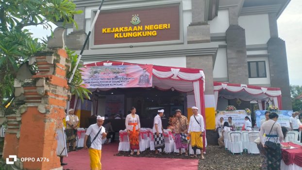 Rangkian peresmian gedung Kejari Klungkung diawali dengan pemlaspasan dan pecaruan yang dipuput oleh Ida Perande Isteri Gede Aan Banjarangkan sebagai simbolis pembersihan serta rasa puji syukur atas selesainya pembangunan.