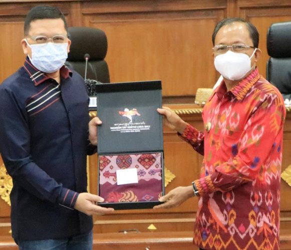 Denpasar – Gubernur Bali Wayan Koster menerima kunjungan kerja Komisi II DPR RI di Ruang Wisma Sabha Utama Kantor Gubernur Bali di Denpasar, Senin (11/10/2021). Kesempatan bertemu jajaran Komisi II DPR RI dimanfaatkan Gubernur Koster untuk menyuarakan aspirasi agar RUU Provinsi Bali bisa dibahas secepatnya.