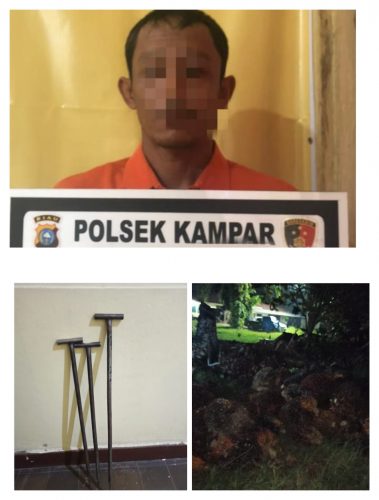 Pelaku pencurian yang diamankan Aparat Kepolisian ini adalah DI (36) warga Desa Padang Mutung Kecamatan Kampar Kabupaten Kampar, bersama pelaku turut diamankan barang bukti 93 tandan buah sawit yang telah dipanen pelaku, sebuah egrek dan 3 buah tojok.