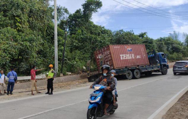 Truck kontener yang jalan dari arah pelabuhan Kariangau menuju arah keluar jalan Soekarno Hatta jalan poros Balikpapan-samarinda, di ketahui sedang bermuatan kramik.