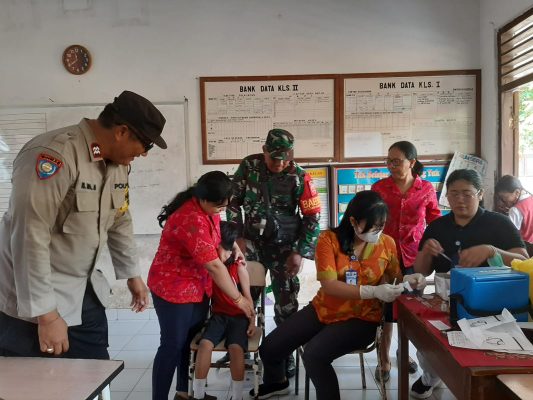 Persindonesia.com Jembrana, Babinsa Desa Pekutatan, Koramil 1617-04/Pekutatan, Serka Putu Somandika melaksanakan pendampingan sekaligus pemantauan kegiatan imunisasi Bias yang dilaksanakan oleh UPTD Puskesmas 1 Pekutatan terhadap anak-anak Sekolah SDN 2 Pekutatan yang bertempat di SDN 2 Pekutatan, Jl. Denpasar-Gilimanuk, Br. Yeh Kuning, Desa Pekutatan, Kecamatan Pekutatan, Kabupaten Jembrana (7/11)