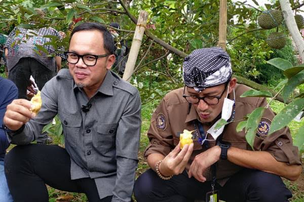 Menteri Pariwisata dan Ekonomi Kreatif (Menparekraf), Sandiaga solahudin Uno mengunjungi destinasi wisata di kawasan Rancamaya Bogor yang merupakan pusat durian di Kota Bogor pada hari, Rabu (10/03).