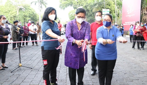 Denpasar | persindo – Ny. Putri Suastini Koster selalu Ketua TP PKK Provinsi Bali dan Ketua Umum Dewan Kerajinan Nasional Daerah (Dekranasda) Provinsi Bali membuka lanjut meninjau pelaksanaan Pasar Rakyat Pemprov Bali Menyambut Hari Raya Nasional yang digelar di Depan Kantor Gubernur Bali, Jumat (7/5/2021). Saat meninjau stand yang menawarkan berbagai produk pangan segar maupun olahan, Ny. Putri Koster mengajak pedagang agar menggunakan tempat atau kemasan yang aman bagi kesehatan.