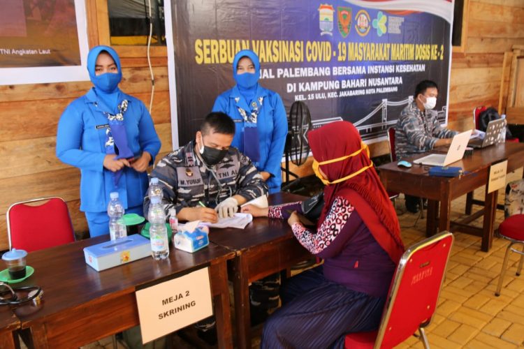 TNI AL Palembang genjot kembali program Vaksinasi nasional Covid-19 bagi masyarakat Maritim di wilayah pesisir Lanal Palembang dengan target 152 orang di Rumpin KBN Jakabaring, Senin( 09/08/2021) dengan vaksinator Balai Kesehatan Lanal Palembang.