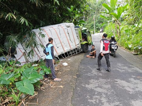 Dan akibat laju kendaraan saat menanjak, sopir kehilangan kendali sehingga truck bermuatan Bata sebanyak 12 Kubik (8 ton) kendaraan mundur lalu tergelincir dan terperosok ke kiri badan jalan.