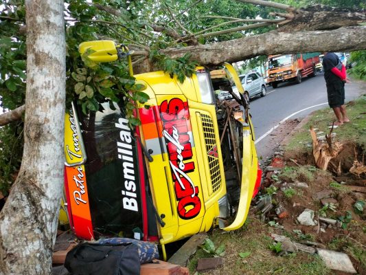 “Truk tersebut datang dari arah barat, awalnya jalan truk tersebut biasa, akan tetapi sampai di lokasi tau-tau truk tersebut oleng ke kiri dan menabrak pohon perindang di sebelah utara jalan kemudian terguling dan melintang di badan jalan sebelah utara,” terangnya.