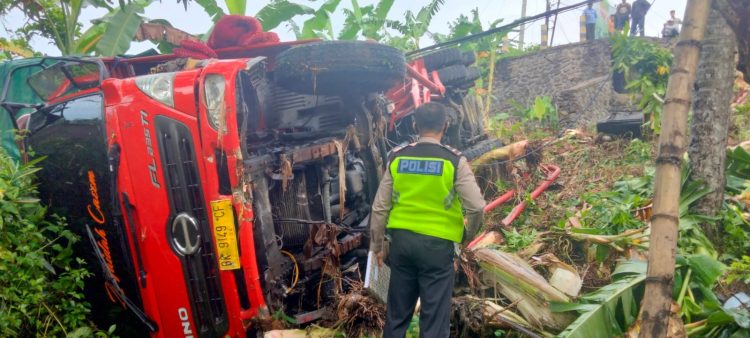 “Saat dilokasi dengan kondisi hujan, truk tersebut bersiap-siap mengambil tikungan kekiri saat itu mesin truknya mati, sopir tidak bisa memutar stir kendaraannya, truk tersebut mundur dan jatuh ke jurang sedalam 6 meter dibawanya merupakan tegalan warga,” terangnya.