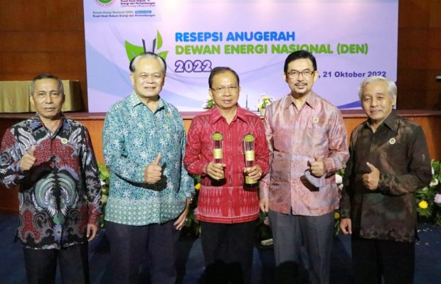 JAKARTA – Pemprov Bali di bawah kepemimpinan Gubernur Bali Wayan Koster dan Wagub Prof. Tjokorda Oka Artha Ardhana Sukawati (Cok Ace) menorehkan prestasi di tingkat nasional dalam bidang Rencana Umum Energi Daerah (RUED). Dewan Energi Nasional (DEN) menganugerahkan dua penghargaan yang langsung diterima Gubernur Bali Wayan Koster pada acara Pemberian Anugerah DEN Tahun 2022 di Hotel Bidakara, Jakarta, Jumat (21/10/2022). Bali meraih penghargaan terbaik kedua kategori Implementasi Perda RUED : “Daerah yang Melaksanakan Transisi Energi” dan menempati posisi ketiga sebagai daerah yang paling aktif mengkampanyekan energi bersih .