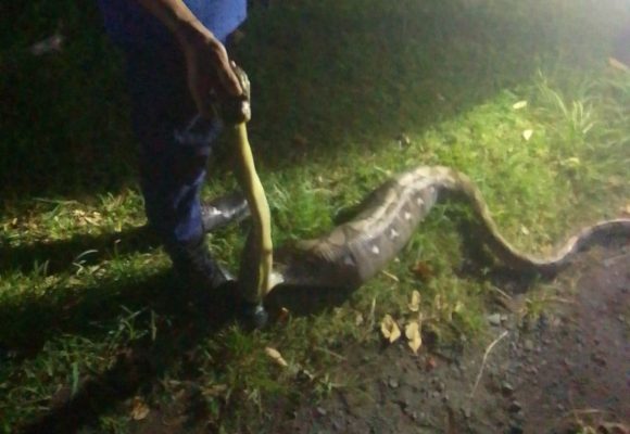 Menurutnya, ular tersebut awalnya diketahui oleh warga disekitar pinggir jalan. Warga yang dikagetkan dengan adanya binatang buas tersebut sontak melakukan penanganan awal dengan mengusir ular tersebut dengan senapan angin. “Karena perut ular besar berisi anak babi tidak mampu bergerak jauh. Ular tersebut sudah kita amankan, terlihat bagian kepalanya tertembak oleh warga,” terangnya.