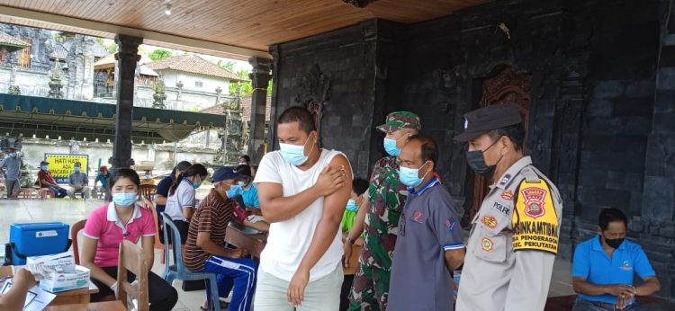 Persindonesia.com Jembrana – Dukung Percepatan Vaksinasi di wilayah, Babinsa Kodim 1617/Jembrana Konsisten dampingi Tim Vaksinator saat kegiatan Vaksinasi Booster kepada warga, seperti halnya yang dilakukan oleh Babinsa Desa Pengeragoan Koramil 1617-04/Pekutatan bersinergi dengan Bhabinkamtibmas memberikan pendampingan kepada Tim Vaksinator dari Puskesmas II Pekutatan saat berlangsungnya Vaksinasi Covid-19. Vaksinasi yang berlangsung di Banjar Mengenuanyar, Desa Pengeragoan, Kecamatan Pekutatan tersebut merupakan Vaksinasi tahap ketiga (Booster) yang diberikan kepada masyarakat umum, Kamis (10/02/2022).