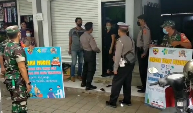 Patroli gabungan personel Koramil 1617-01/Negara bersama personel dari Polsek Negara kembali digelar dengan menyasar pusat aktivitas masyarakat dan pelaku usaha di sepanjang area pertokoan di wilayah Kecamatan Negara. Petugas gabungan pun mendatangi para pedagang pasar maupun pertokoan untuk mengingatkan agar mematuhi peraturan dalam pemberlakuan PPKM Level II dan mensosialisasikan vaksinasi, Selasa (19/04/2022)