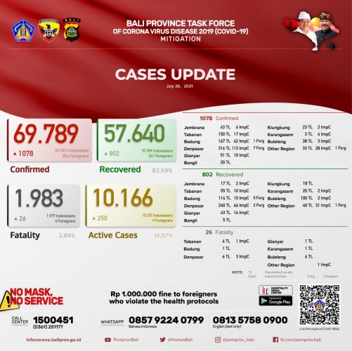 Data pertambahan kasus hari ini sebagai berikut : terkonfirmasi sebanyak 1.078 orang (844 orang melalui Transmisi Lokal, 225 PPDN dan 9 PPLN),sembuh sebanyak 802 orang dan 26 pasien meninggal dunia.