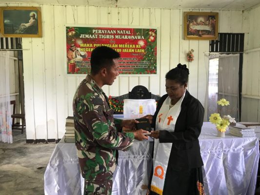 Sementara itu, Tokoh Agama Gereja Katholik Indonesia (GKI) Muara Nawa Ibu Pdt Lena (39) yang mewakili seluruh jemaat Gereja GKI saat menerima bantuan Alkitab merasa bersyukur dan berterima kasih atas bantuan yang di berikan oleh Satgas Yonif Raider 200/BN. “Saya mewakili seluruh Jemaat mengucapkan terima kasih atas bantuan saudara-saudara tentara dari Pos Airu yang saat ini bertugas,” ujarnya.