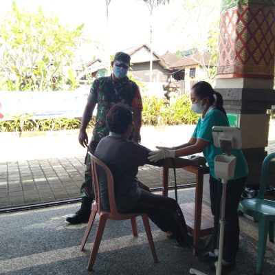Persindonesia.com Jembrana – Babinsa Desa Gumbrih Koramil 1617-04/ Pekutatan, Kodim 1617/Jembrana Serma Ketut Subryana bersinergi dengan Bhabinkamtibmas memberikan pendampingan terhadap Tim Vaksinator dari Puskesmas II Pekutatan saat berlangsungnya vaksinasi Covid-19. Vaksinasi yang berlangsung di Banjar Pasar, Desa Gumbrih, Kecamatan Pekutatan, Kabupaten Jembrana tersebut merupakan vaksinasi tahap ketiga (Booster) yang diikuti oleh 38 orang baik lansia maupun masyarakat umum, Kamis (24/03/2022).