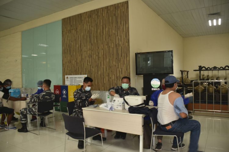 Dengan target yang telah tetapkan oleh pemerintah dalam mensukseskan Vaksinasi massal untuk masyarakat, Vaksinator TNI AL dalam hal ini Lantamal III Jakarta melaksanakan kegiatan Vaksin secara bersamaan di pelabuhan penumpang Tanjung Priok dan di Pasar Ikan Modern Muara Baru, Jakarta Utara.(Rabu, 7/7/2021).