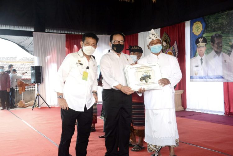 Denpasar – Wakil Gubernur Bali Tjokorda Oka Artha Ardana Sukawati mendampingi Menteri Pertanian RI Syahrul Yasin Limpo dalam penyerahan Bantuan Pupuk Hayati Cair, Benih dan Alsintan di Provinsi Bali Tahun 2021 oleh Kementerian Pertanian RI di Subak Erjeruk, Sukawati, Gianyar, Sabtu (19/6).