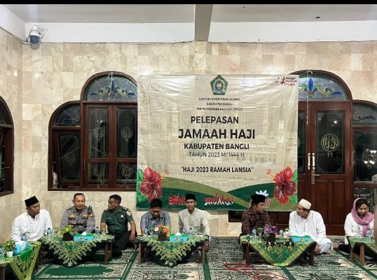 Dengan Rangkaian giat pelepasan Sholat Isya berjamaah, Pembacaan Sholawat dengan di iringi Hadrah Rebana MT Sunnaturhosul Kintamani, Pembukaan oleh panitia dengan diawali pembacaan doa surat Al- Fatihah, Pembacaan Ayat Suci Alquran, Pembacaan Laporan oleh Kasi Penyelenggara Haji dan Umroh Kemenag Bangl pada intinya Patut kita syukuri setiap tahun jamaah calon haji asal Kab. Bangli ada yang berangkat ke tanah suci Mekah. Tahun ini Jamaah Haji Kab. Bangli berjumlah 6 orang terdiri dari 3 Jamaah Haji Laki-laki dan 3 Jamaah Haji Perempuan yang mana jamaah Haji Kab. Bangli dengan usia paling tua umur 58 Tahun dan yang termuda umur 55 tahun dan alhamdulillah semua dalam keadaan sehat dan Bagi Jamaah Haji nantinya ada pendampingan dari Team Kesehatan dalam setiap rombongan.